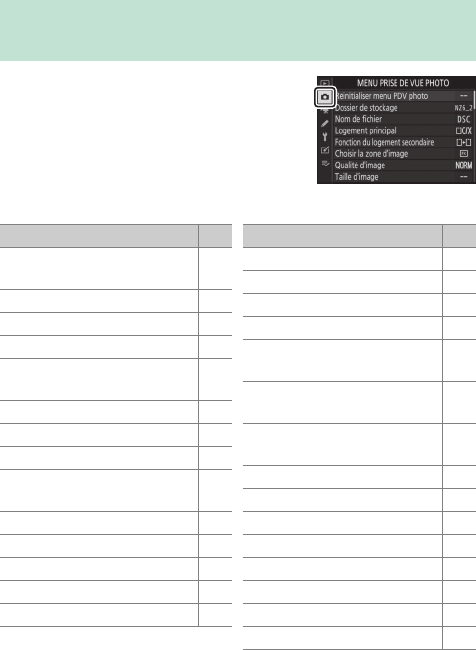 Le menu Prise de vue photo contient les rubriques suivantes :