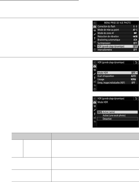 - Menu Prise de vue vidéo : options de prise de vue vidéo