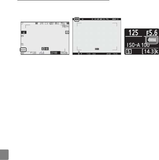 Kai fotoaparatas įjungtas, akumuliatoriaus įkrovos lygis