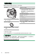 D 注意事项:触摸屏 • 触摸屏可对静电作出反应。使用指甲或戴着手套触摸时,屏幕可能不会作出反应。戴 着手套使用触摸屏时,为了提高反应速度,请在设定菜单中将 [ 触控控制 ]>[ 手套模式 ] 选为 [ON]。 • 切勿使用锋利物品触碰屏幕。 • 切勿用力过度。 • 当贴有第三方保护膜时,屏幕可能不会作出反应。 • 同时触摸多处地方时,屏幕可能不会作出反应。 A 启用或禁用触控控制 您可使用设定菜单中的 [ 触控控制 ] 项目启用或禁用触控控制。 58 照相机部件