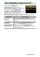 Neuer Ansichtsmodus für Blitzfotografie [Immer] und [Nur ohne Blitz] wurden zu den für Individualfunktion d9 [Ansichtmodus (Foto Lv)] > [Auswirk. d. Einstellungen darstellen] verfügbaren Optionen hinzugefügt. Menüpunkt [Auswirk. d. V Einstellungen darstellen] 16 Neuer Ansichtsmodus für Blitzfotografie Beschreibung Die Wirkung von Einstellungen wie Weißabgleich, Picture-Control-Konfigurationen oder Belichtungskorrektur ist in der Aufnahmeanzeige sichtbar. Das Drücken von 2, während [Auswirk. d.