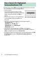 Neue bei Individualfunktion g2 »Benutzerdef. Bedienelemente« zuweisbare Funktionsarten Menüpunkt Beschreibung [Zwischen Das Drücken des Bedienelements schaltet zwischen den K FX und DX Bildfeldern [FX] und [DX] um. umschalten] Das Drücken des Bedienelements ändert die für [DarstelIndividualfunktion g11 [Darstellungshilfe] gewählte p lungshilfe] Einstellung von [ON] auf [OFF], oder umgekehrt. Drücken Sie das Bedienelement, um die [Hochfreq.Feinabstimmung der Belichtungszeit einzuschalten.