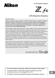 Specifikacijos Nikon Z fc skaitmeninis fotoaparatas Tipas Tipas Skaitmeninis fotoaparatas su keičiamų objektyvų palaikymu Objektyvo laikiklis Nikon Z laikiklis Objektyvas Suderinami objektyvai ・ Z tvirtinimo NIKKOR objektyvai ・ F tipo tvirtinimo NIKKOR objektyvai (reikalingas tvirtinimo adapteris; gali būti taikomi apribojimai) Efektyvūs pikseliai Efektyvūs pikseliai 20,9 mln Tipas 23,5 × 15,7 mm CMOS jutiklis ( Nikon DX formatas) Vaizdo jutiklis Iš viso pikselių 21,51 mln Dulkių mažinimo sistema