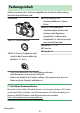 D Selbstporträtmodus Beachten Sie im Selbstporträtmodus Folgendes: ・ Während des Selbstporträtmodus sind andere Bedienelemente außer Ein-/Ausschalter, Auslöser, Videoaufnahmetaste, Foto-/VideoWahlschalter, Modus-Wahlschalter, Verschlusszeit-Einstellrad, ISOEmpfindlichkeits-Einstellrad und Belichtungskorrektur-Einstellrad deaktiviert.