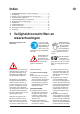heid van het apparaat negatief beïnvloeden. Gebruik voor de veiligheid alleen originele reserveonderdelen van of goedgekeurd door Nilfisk. Hogedrukslangen, fittingen en aansluitstukken zijn belangrijk voor de veiligheid van het apparaat. Gebruik alleen slangen, fittingen en aansluitstukken aanbevolen door Nilfisk. Gebruik het apparaat niet als een elektriciteitskabel of belangrijke onderdelen van het apparaat beschadigd zijn, zoals veiligheidsapparatuur, hoge-drukslangen en sprayhandel.