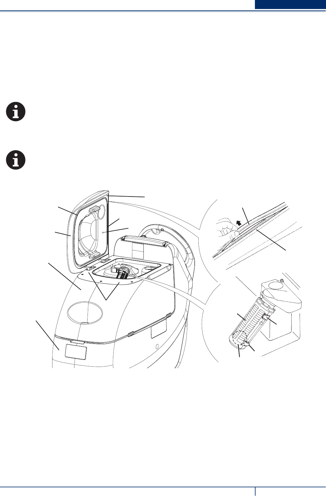 Nettoyer et laver à l’eau propre le couvercle (A), les réservoirs (B et C) et la grille d’aspiration avec fermeture automatique à 4.