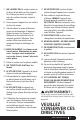 7. NE LAISSEZ PAS le cordon traîner sur le dessus d’une table ou d’un comptoir. Ne le laissez pas entrer en contact avec des surfaces chaudes, comme la cuisinière. 8. Posez toujours l’appareil sur une surface sèche et de niveau. 10. MISE EN GARDE : Les lames sont tranchantes. Manipulez-les avec soin. Lorsque vous manipulez un jeu de lames, tenez l’arbre de cette pièce. 11. Évitez le contact avec les pièces mobiles. 12. NE TENTEZ PAS d’affûter les lames. 13.