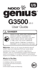 G3500 V2.0 User Guide DANGER PRIOR TO USE, READ AND UNDERSTAND PRODUCT SAFETY INFORMATION. Failure to follow the instructions may result in ELECTRICAL SHOCK, EXPLOSION, or FIRE, which may result in SERIOUS INJURY, DEATH, DAMAGE TO DEVICE or PROPERTY. Do not discard this information. Welcome. Thank you for buying the NOCO Genius® G3500. Read and understand the User Guide before operating the charger. For questions regarding our chargers, view our comprehensive support information at www.no.co/support.