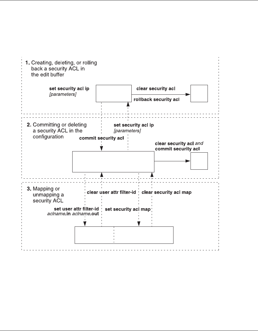 Figure 16 provides a visual overview of the way you use WSS Software commands to set a security ACL, commit the