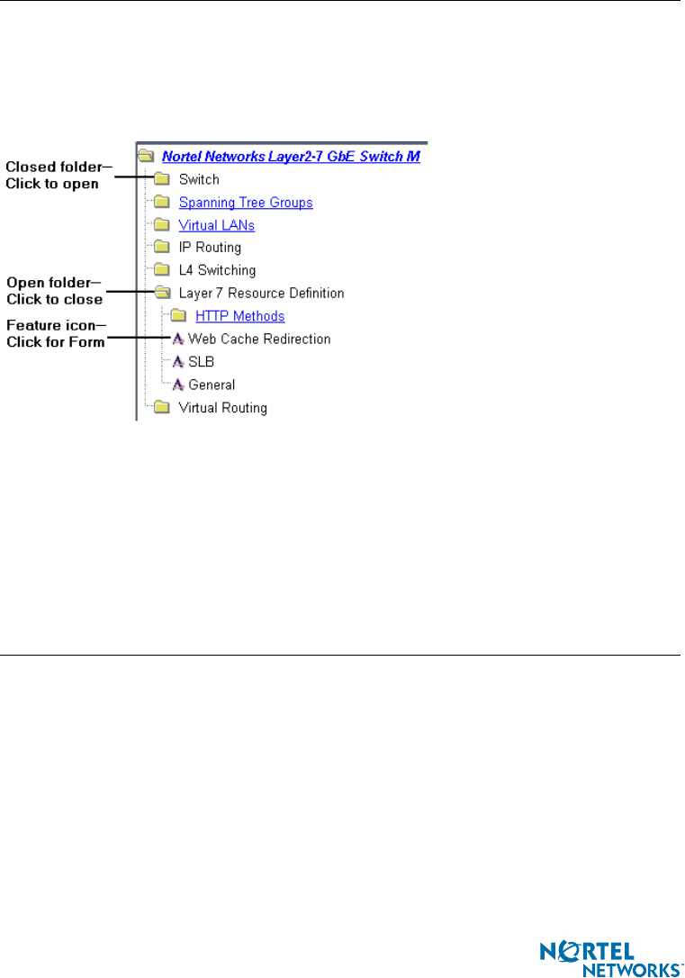 The navigation window is used for selecting a particular switch feature to act upon. Status, sta-