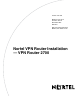 Preface The VPN Router 2700 is part of the Nortel VPN Router product family. Nortel VPN Router 2700 supports secure, reliable IP VPNs in a single, integrated hardware device. Throughout this guide, the VPN Router 2700 is also referred to as the gateway. This guide provides instructions about how to install the VPN Router 2700 in an equipment rack and how to install and replace option cards and dual inline memory modules (DIMM).