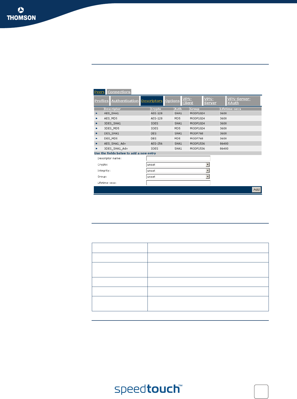 A number of Peer Security Descriptors are pre-configured in the SpeedTouch™.