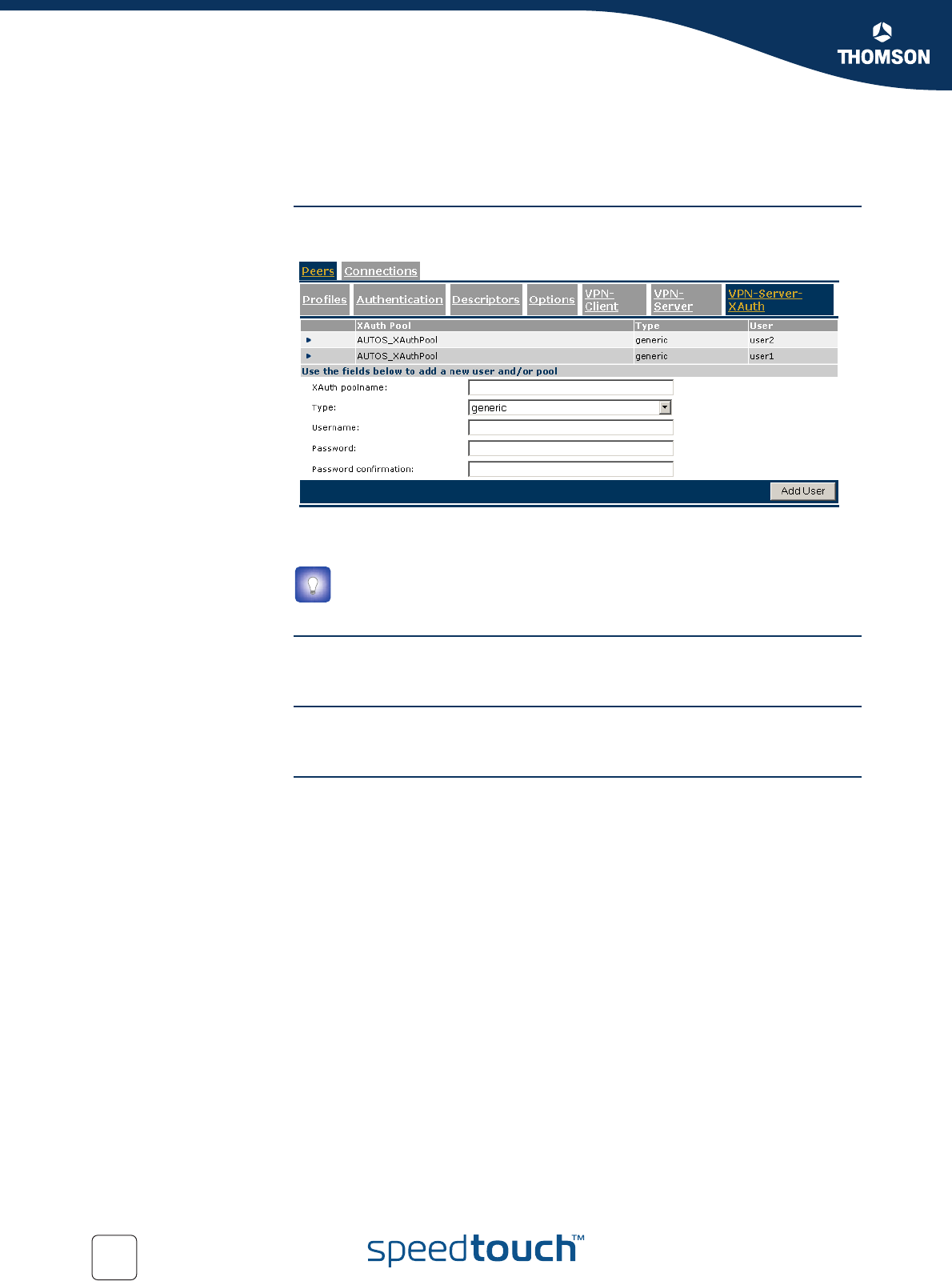 The VPN-Server-XAuth page allows you to define XAuth user pools and to add