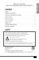 CONTENTS SAFETY . . . . . . . . . . . . . . . . . . . . . . . . . . . . . . . . . . . . . . . . . . 2 IMPORTANT SAFEGUARDS . . . . . . . . . . . . . . . . . . . . . . . . . . . . . . 3 ADDITIONAL IMPORTANT SAFEGUARDS . . . . . . . . . . . . . . . . . . . . . 3 INTRODUCTION . . . . . . . . . . . . . . . . . . . . . . . . . . . . . . . . . . . . . 4 PARTS & ASSEMBLY . . . . . . .