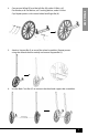 Connect one Wheel (E) and the Left Bar (M) with a #2 Bolt, a #5 Flat Washer, a #6 Flat Washer, a #7 Locking Washer, and a #10 Nut Cap. Repeat process with second wheel and Right Bar (N). 5. Attach a Support Bar (I) to one of the wheel assemblies. Repeat process using the second wheel assembly and second Support Bar (I). 6. Use the Back Cross Bar (O) to connect the wheel and support bar assemblies. ENGLISH 4.