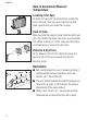 English How to Operate the Unit A °C/°F and Battery C Pull open the unit’s handle using the finger indents near the trigger to access the C/F switch or to insert/remove the battery. To toggle between °C and °F, push the switch (A). Insert the 9v battery positive side first into the battery compartment. NOTE: The battery door is detachable. F + - 9v Battery Operating the Unit To measure a temperature, point unit at object and pull the trigger.