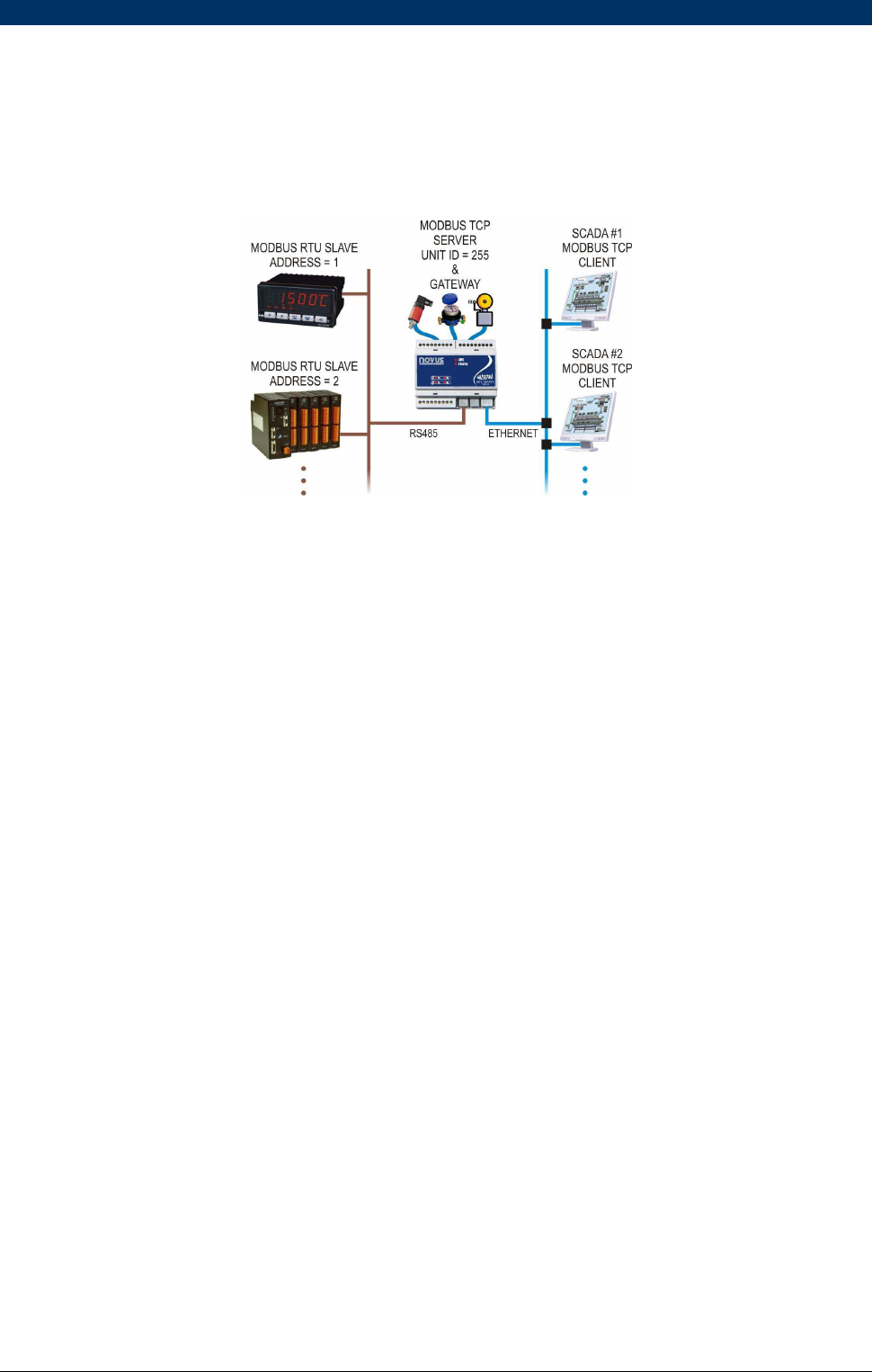 ModbusRTU sub-network. SCADA software are examples of ModbusTCP clients. The following figure shows a typical ModbusTCP network,