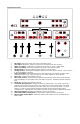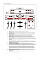 Top Panel Overview 1. 2. 3. 4. 5. 6. 7. 8. 9. 10. 11. 12. 13. 14. Mic Fader: Adjusts the audio level of the microphone input. Line Fader: Adjusts the audio level of devices connected to the Line In jacks. Audio 1/2 Fader: Controls the overall level for the Source 1 and 2 audio inputs. Audio Crossfader: Fades audio between the Audio 1 and Audio 2 inputs. Master Fader: Controls the Master audio output level of the mixer. Cueing Section: Controls the headphone output (see Cueing Section below).