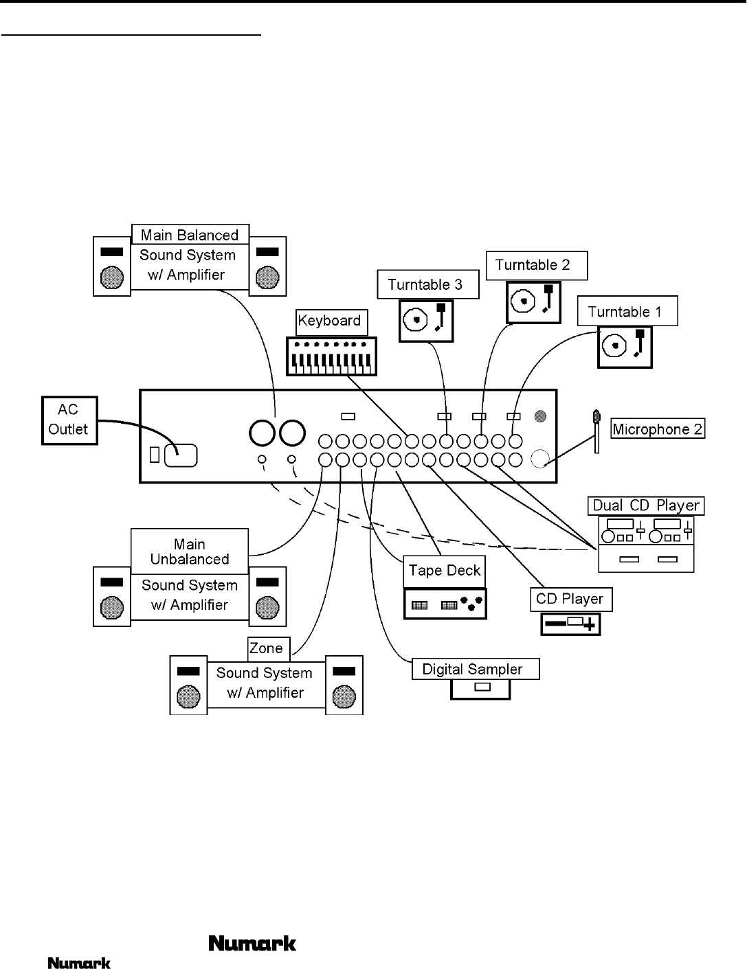 Study this setup diagram. Make sure all faders are at "zero" and all devices are off. First, connect all stereo