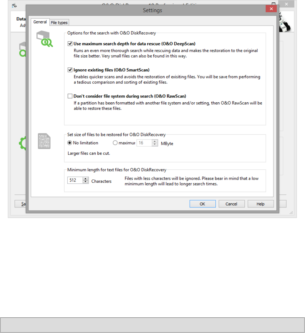 It is possible to determine which types of files O&O DiskRecovery will scan for. By default all data types are con-