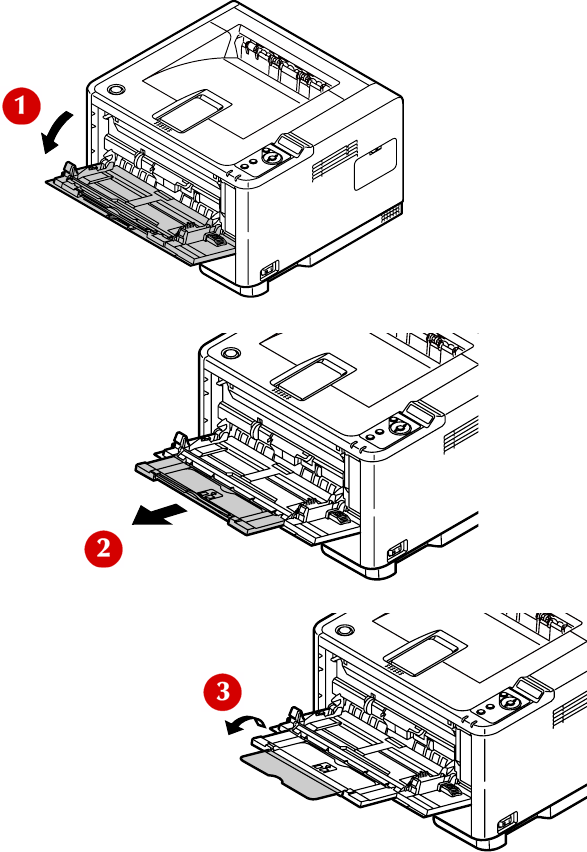 1. Tirez vers le bas le bac multifonction (1), sortez le guide