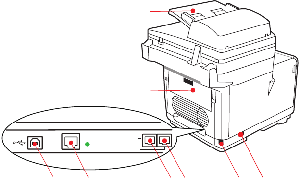 4. Telephone line connection. 8. Rear paper stacker (closed).