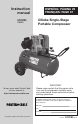 Instruction manual ESPAÑOL: PÁGINA 29 FRANÇAIS: PAGE 57 Oillube Single-Stage Portable Compressor MODEL C5510 To learn more about Porter-Cable visit our website at: http://www.porter-cable.com ® IMPORTANT Please make certain that the person who is to use this equipment carefully reads and understands these instructions before starting operations. The Model and Serial No. plate is located on the frame. Record these numbers in the spaces below and retain for future reference. Model No. Type Serial No.