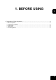 1. BEFORE USING 1 1. Description of Each Component ............................................................................................8 • • • • • Main components................................................................................................................................8 Configuration of options ......................................................................................................................9 Control panel...................................................
