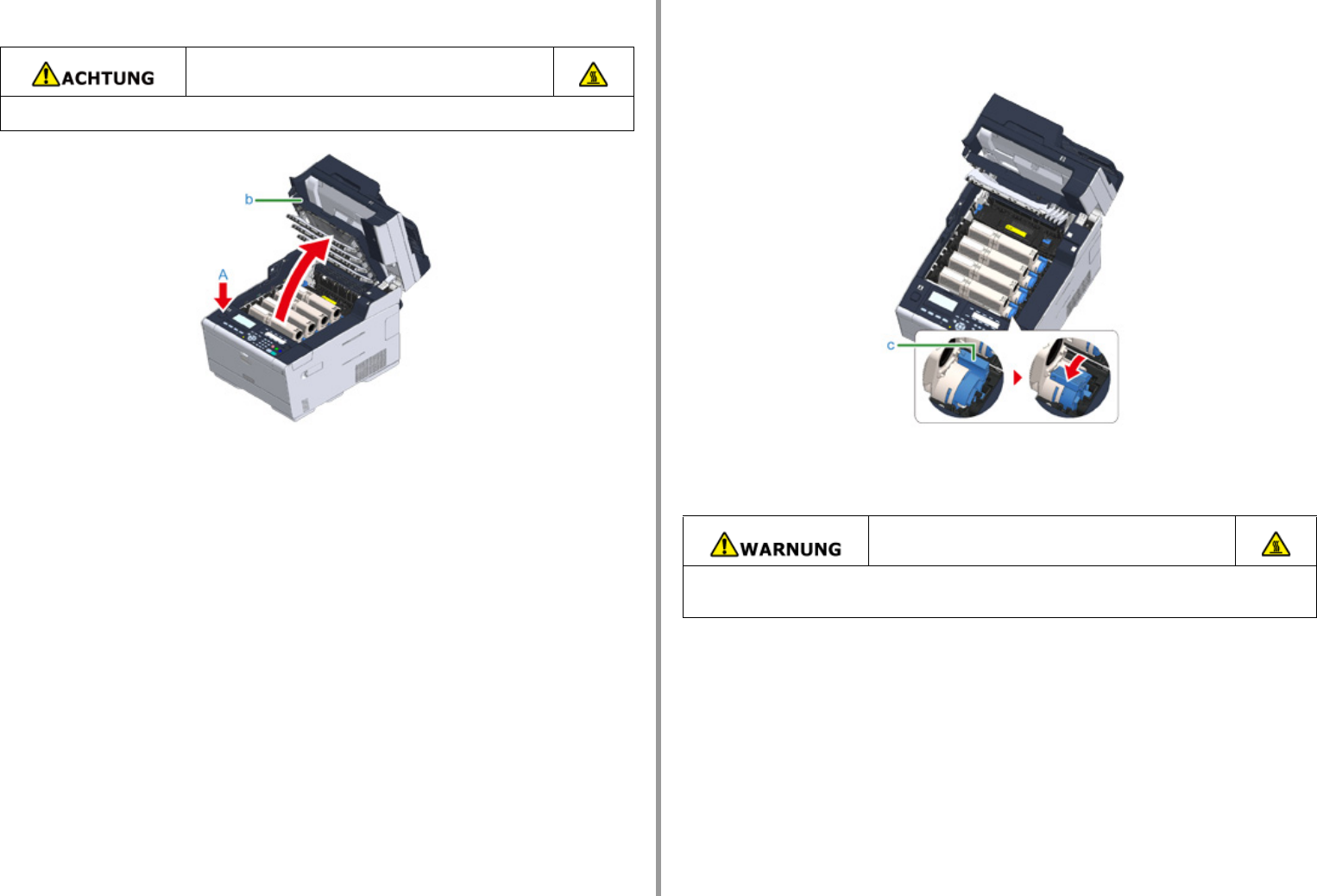 Drücken Sie die Spitze des blauen Hebels (c) der Tonerkartusche zusammen