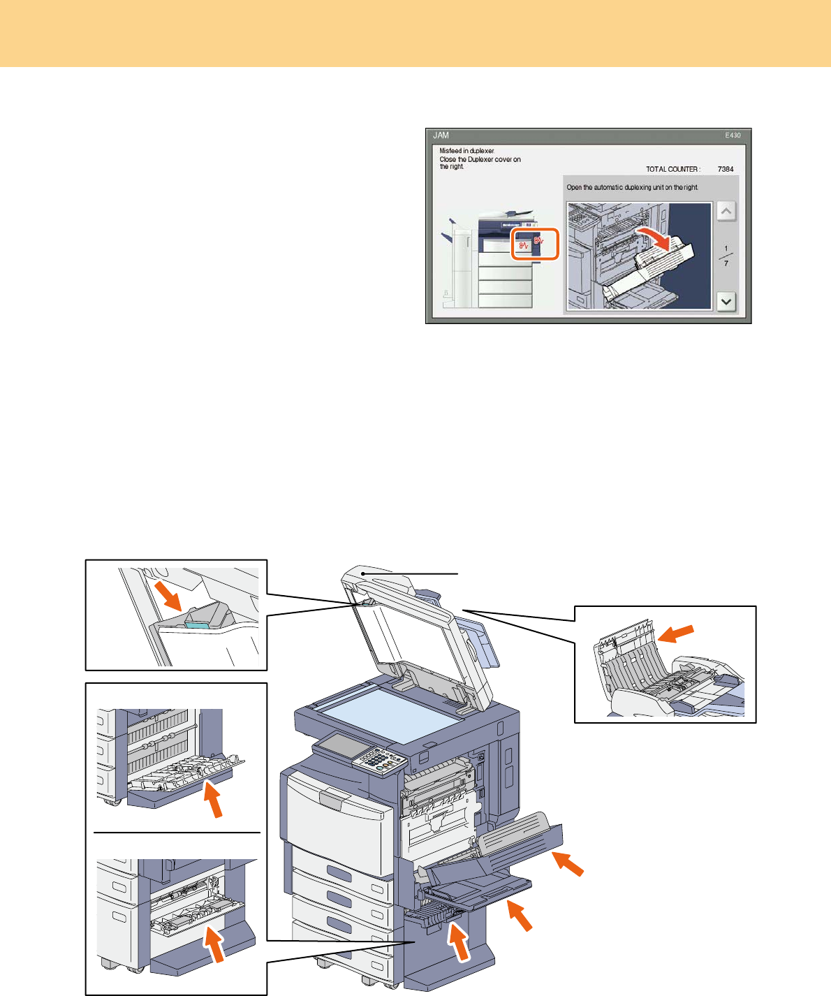 The covers of the equipment and the options to be opened when paper jams occur are as indicated by the arrows in the