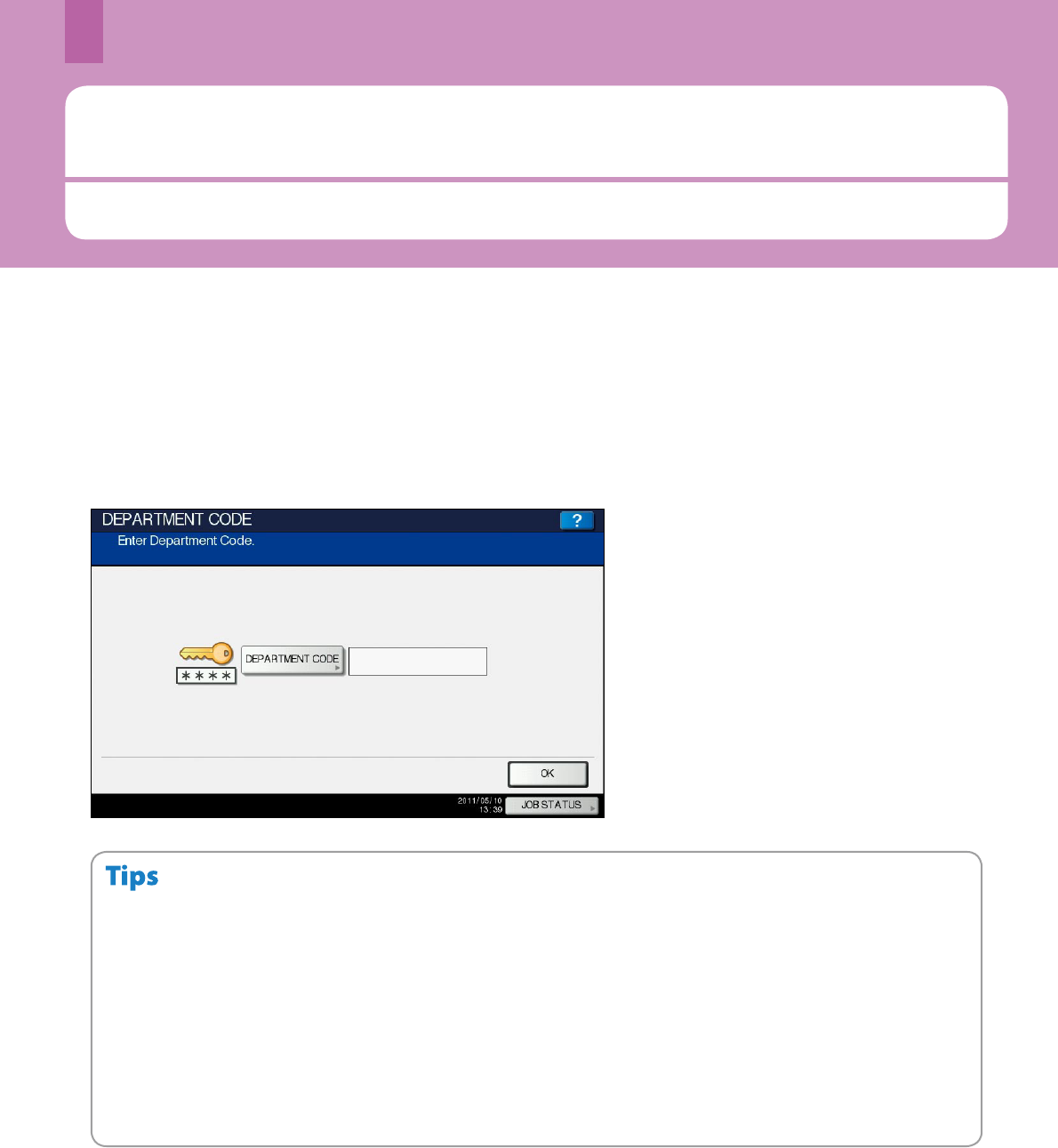 Key in a department code (max. 63 digits) previously registered and press [OK] on the touch panel. The menu will switch