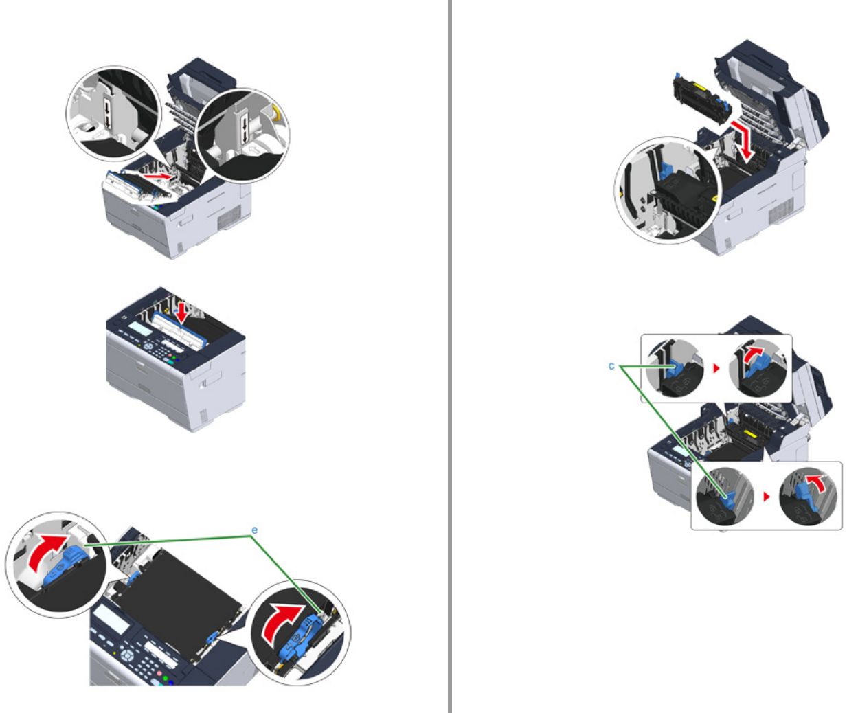 Kippen Sie die Verriegelungshebel (c) an beiden Seiten der Fixiereinheit.