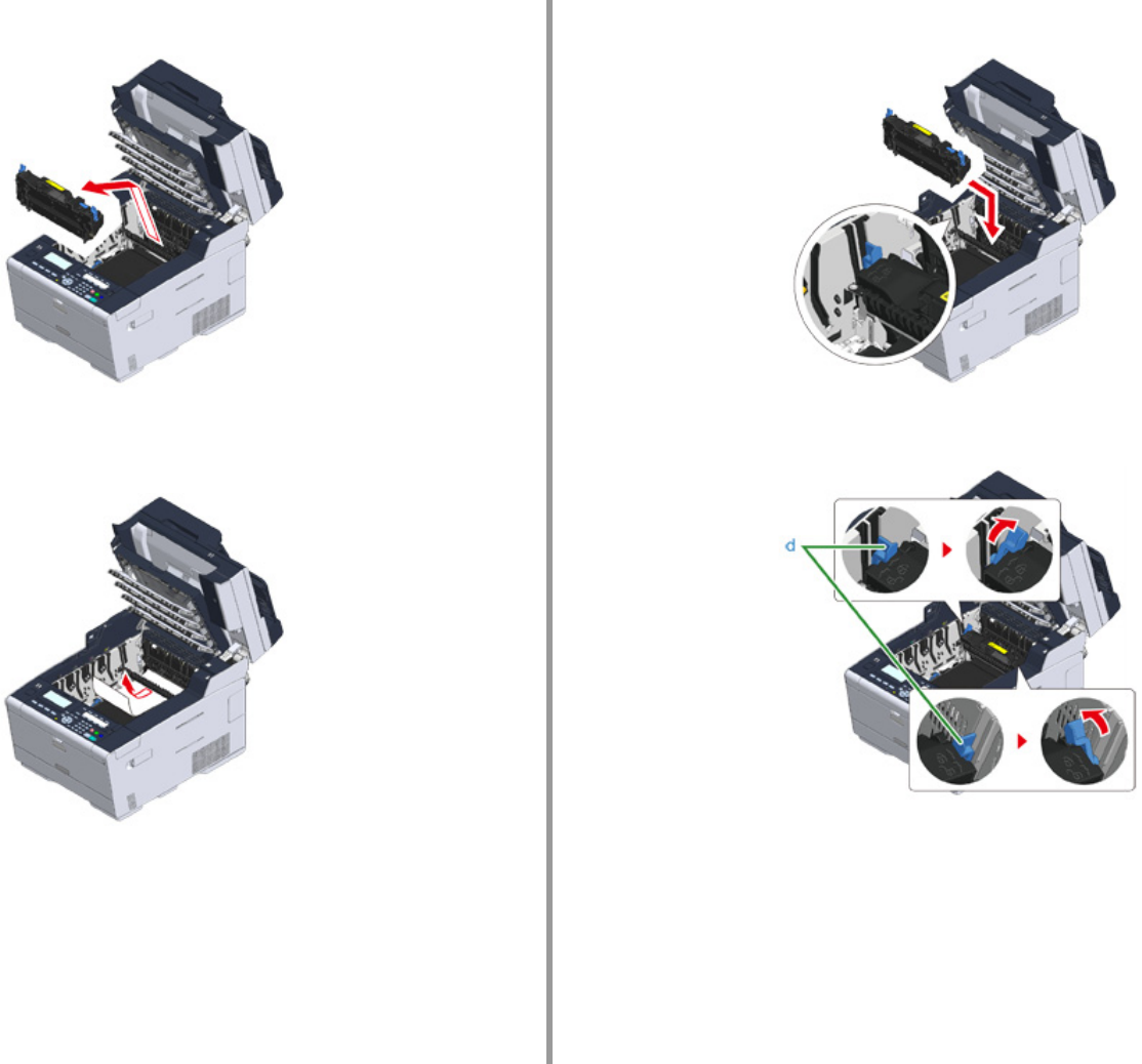 Kippen Sie die Verriegelungshebel (d) an beiden Seiten der Fixiereinheit.