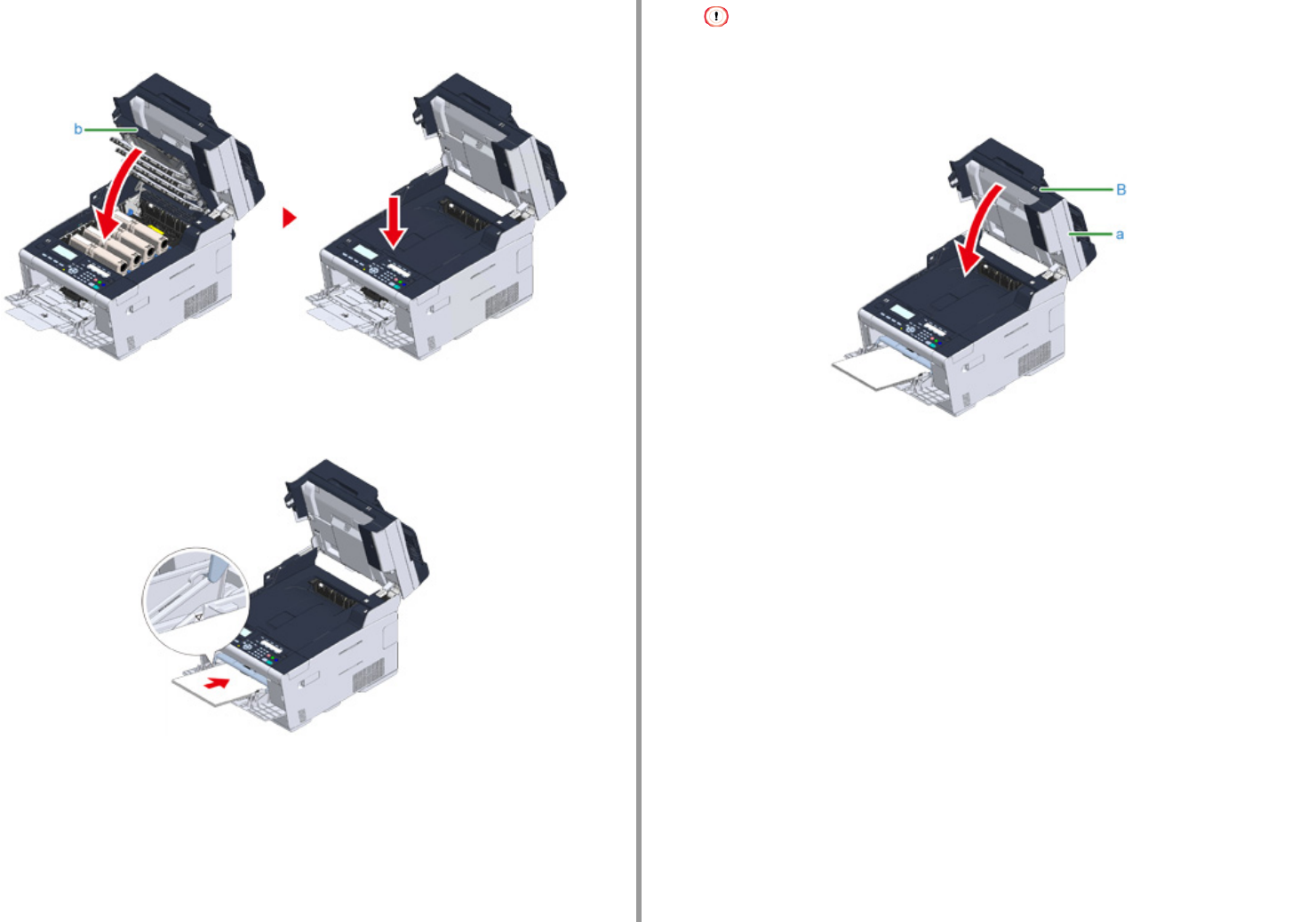 Schließen Sie das Ausgabefach (b) langsam und drücken Sie zur Bestätigung