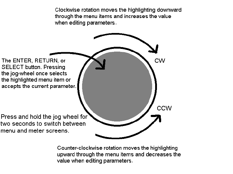 Pressing inward on the jog-wheel activates the Enter, Return or Select button function as follows: