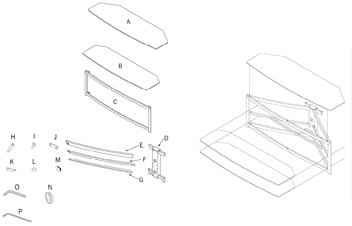 Carefully lift and slide Middle Glass Shelf (B) into place on center frame members.