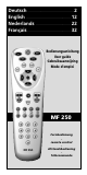 Probleem en oplossing * Het rode lampje (LED onder een apparaat toets) van de MF-250 blinkt niet als u op een toets drukt? - Vervang dan de batterijen met nieuwe AAA/LR03 batterijen. * De MF-250 reageert niet als u een toets indrukt? - Verzeker u ervan dat de batterijen goed zijn en dat de MF-250 op het te bedienen apparaat gericht is. * De MF-250 bedient u apparaten niet? - a) Probeer alle codes die bij uw merk vermeld staan. b) Probeer de zoekmethode op pagina 28.