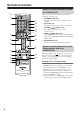 Remote Controller—Continued 1 2 Connecting Terminal LINE/MD (A-9355) DOCK (A-9355) LINE/DOCK (A-9155) CD TUNER TAPE Component and (Input Name) Button on Remote Controller MD Recorder (MD) RI Dock (DOCK) CD Player (CD) Tuner (TUNER) Cassette Tape Deck (TAPE) 1-9 1-9 1-9 10/0 10/0 10//0 >10 >10 >10 BAND BAND FM MODE FM MODE PRESET +/– PRESET +/– TUNING 3 / TUNING DIMMER / DIMMER * 4 * * 5 / / / / 6 RANDOM RANDOM SHUFFLE RANDOM DOLBY NR 7 REPEAT REPEAT REPEAT