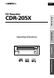 English CD Recorder Before using CDR-205X Connections Operating Instructions AUDIO CD RECORDER REC AMCS CD DUBBING FINALIZE EDIT/NO YES STANDBY INPUT DISPLAY (PUSH TO ENTER) CDR-205X Operations DUAL OPTICAL INPUT ON / OFF Other Information