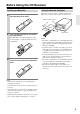 Before Using the CD Receiver Installing the Batteries 1 Detach the battery cover by pressing the tab and pulling up the cover. Using the Remote Controller When you operate the remote controller, point it at the CD receiver’s remote control sensor, as shown below. Remote control sensor 5 x. pro ) p A ft. (16 m CD receiver 2 3 Insert two AA-size batteries into the battery compartment. Carefully follow the polarity diagram (positive (+) and negative (–) symbols) inside the battery compartment.