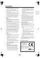 Precautions 1. Recording Copyright—Unless it’s for personal use only, recording copyrighted material is illegal without the permission of the copyright holder. 2. AC Fuse—The AC fuse inside the unit is not userserviceable. If you cannot turn on the unit, contact your Onkyo dealer. 3. Care—Occasionally you should dust the unit all over with a soft cloth. For stubborn stains, use a soft cloth dampened with a weak solution of mild detergent and water. Dry the unit immediately afterwards with a clean cloth.