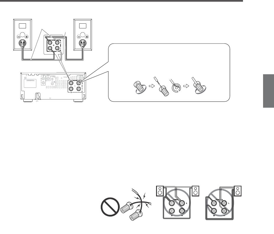 • Branchez la borne positive (+) de chaque enceinte à la borne positive (+) de l’ampli-tuner CD. Branchez la