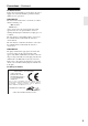 Precautions 1. Recording Copyright—Unless it’s for personal use only, recording copyrighted material is illegal without the permission of the copyright holder. 2. AC Fuse—The AC fuse inside the unit is not userserviceable. If you cannot turn on the unit, contact your Onkyo dealer. 3. Care—Occasionally you should dust the unit all over with a soft cloth. For stubborn stains, use a soft cloth dampened with a weak solution of mild detergent and water. Dry the unit immediately afterwards with a clean cloth.