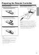 Preparing the Remote Controller Point the remote controller toward the remote control sensor. 30˚ Ap p ro x. 30˚ t Remote control sensor fe e 1 Remove the battery compartment cover by pressing the tab and lifting up the cover. Using the Remote Controller 16 Inserting the Batteries 2 Insert the two batteries (size AAA/R3). Be sure to match the + and – ends of the batteries with the diagram inside the battery compartment. Notes 3 Replace the battery compartment cover.