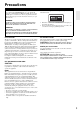 Precautions This unit contains a semiconductor laser system and is classified as a “CLASS 1 LASER PRODUCT.” So, to use this model properly, read this Instruction Manual carefully. In case of any trouble, please contact the store where you purchased the unit. To prevent being exposed to the laser beam, do not try to open the enclosure. The label below is applied on the rear panel except for USA and Canadian models. DANGER: VISIBLE LASER AND INVISIBLE RADIATION WHEN OPEN AND INTERLOCK FAILED OR DEFEATED.