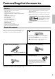 Features/Supplied Accessories Features • • • • • • • • • • • • • • Plays DVD Video Discs, Video CDs, CDs 10-bit Video DAC Simultaneous output to all video connections Digital outputs pass DTS®*1, Dolby®*2 Digital and PCM Signals Built-In Dolby® Digital decoder Full-function remote controller Direct Digital Path Pass 96 kHz PCM digital stream CD-R and CD-RW playable MP3/WMA*3 CD Playback JPEG CD Playback Progressive Scan Video Output PAL Progressive (Not on American model) VLSC*4 (Vector Liner Shaping Circu