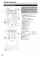 Remote Controller r_j__ For detailed information, see the pages in parentheses. @ ON/STANDBY button (@ 21) (_) REMOTE MODE/INPUT SELECTOR buttons (@ 22) (_) SP LAYOUT button (@ 23) @ Arrow i,/¥/_1/_ (_ and ENTER buttons SETUP button (_ 33) @ LISTENING MODE buttons (@ 28) (Z) DIMMER button (@ 22) (_) DISPLAY button (_ 22) (_ MUTING button (@ 23) @ VOL A/_r button (@ 22) _) RETURN button AUDIO button (@ 41) SLEEP button (@ 23) i.............................. LISTENING ..............................