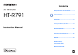 Contents AV RECEIVER HT-R791 Safety Information and Introduction ............2 Table of Contents ...........................................5 Connections .................................................11 Turning On & Basic Operations..................19 Instruction Manual Advanced Operations ..................................43 Controlling Other Components...................66 Appendix .......................................................