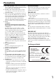 Precautions 1. Recording Copyright—Unless it’s for personal use only, recording copyrighted material is illegal without the permission of the copyright holder. 2. AC Fuse—The AC fuse inside the unit is not userserviceable. If you cannot turn on the unit, contact your Onkyo dealer. 3. Care—Occasionally you should dust the unit all over with a soft cloth. For stubborn stains, use a soft cloth dampened with a weak solution of mild detergent and water. Dry the unit immediately afterwards with a clean cloth.