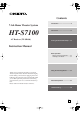 Contents Introduction ..................................... 2 7.1ch Home Theater System HT-S7100 Connection .................................... 14 AV Receiver (TX-SR606) Turning On & First Time Setup..... 37 Instruction Manual Basic Operation Playing your AV components ....... 47 Listening to the Radio .................. 51 Using the Listening Modes .......... 57 Thank you for purchasing an Onkyo 7.1ch Home Theater System.